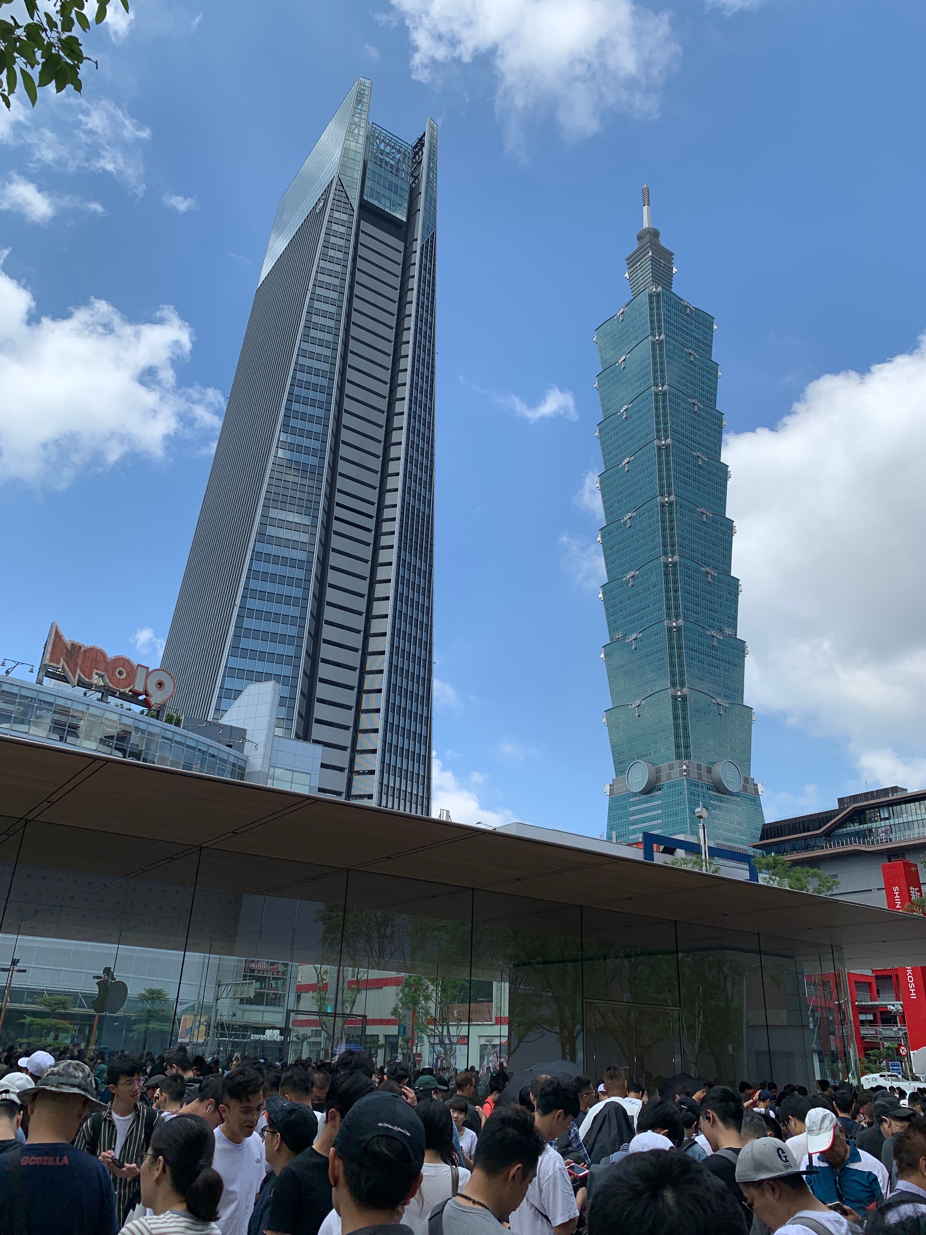 2019.6.15 早上 9:25,我第一次加入了 Apple Store 開幕的隊伍中,這個人數真的是比我想像中的還要多非常非常多,我們這裡是排隊人潮的第三面,正面跟右邊的隊伍雖然沒有這一面這麼長,但是人數估計也有一兩千人了,要不是我知道當年 101 開幕時有 5000 件 T-shirt,我可能真的會很擔心會不會拿不到。