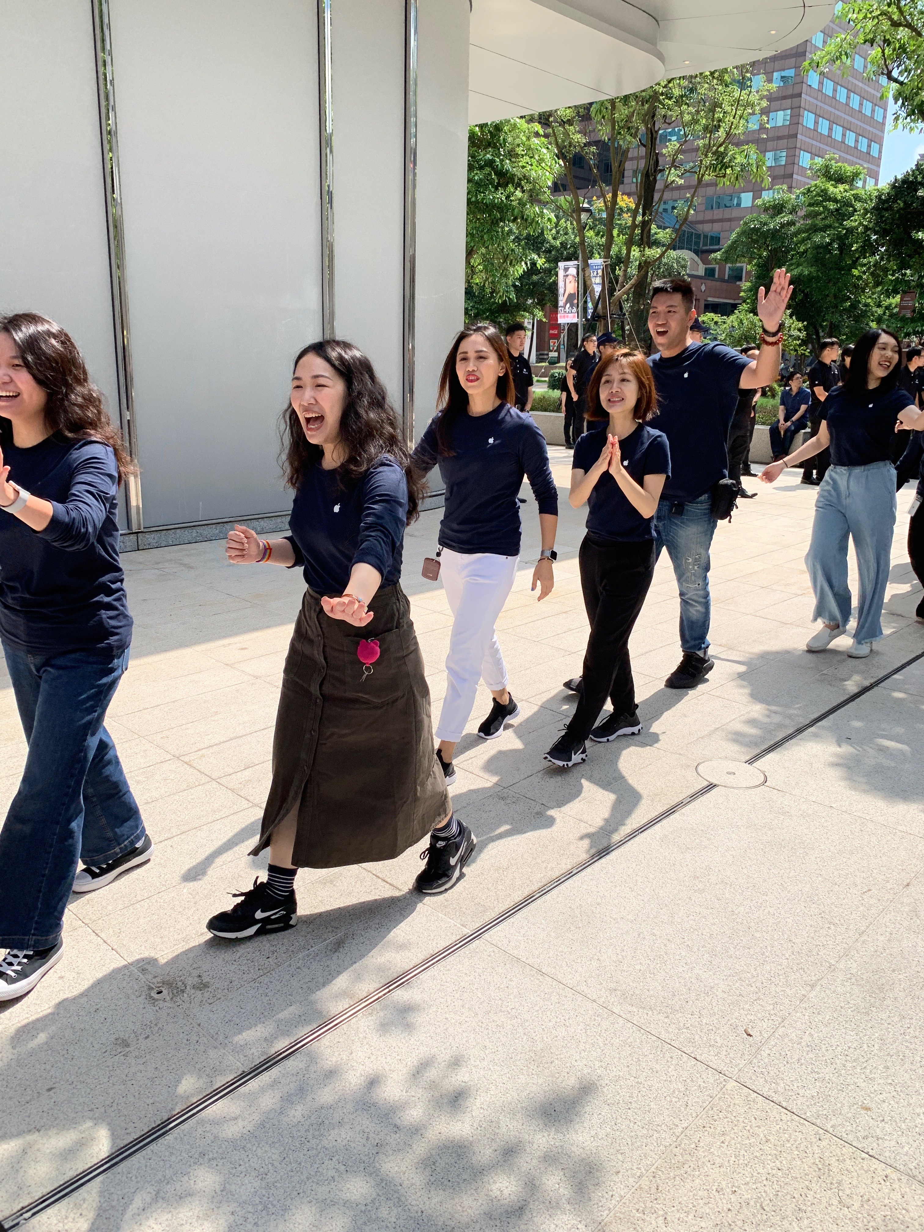 大約 9:35 分時,店員們從後方遠百的出口出來小跑步繞了 Apple Store 一圈,跟排隊的果粉們打招呼、擊掌,從這個時候就能感覺到店員們的熱情了,而且店員真的非常多,足夠把所有排隊的人圍起來還有剩(有一部份是 101 派過來支援的)。