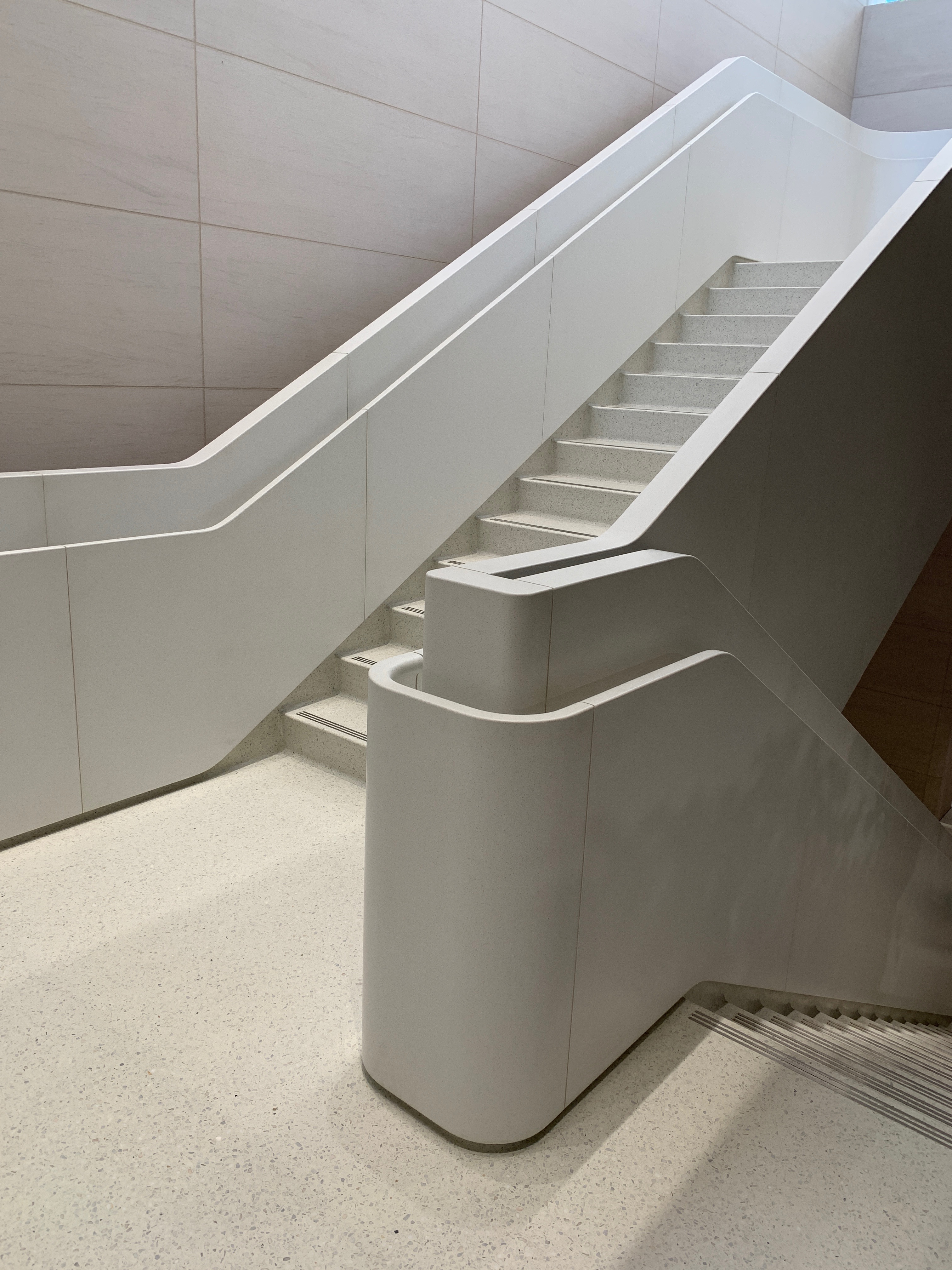 與 Apple Park Visitor Center 中的樓梯長得一樣,是由蘋果御用專業配音員兼任傳奇設計師 Jony Ive 親手設計的,仔細看的話可以看到他的扶手還設計了一個內凹,握起來手感真的超讚的。
