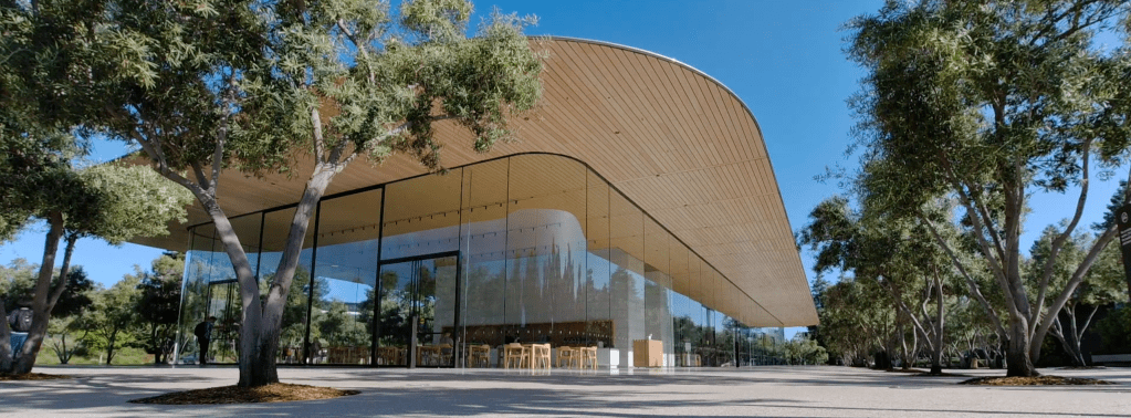 2019.12.18,第一次來到 Apple Park,雖然不能真的進到 Apple Park 的主體,只能在外面的這棟訪客中心參觀,但蘋果官網是這麼形容這棟訪客中心的,”An architectural extension of our private campus”,這裡就像是主要建築的延伸一樣,無論是設計或是建材,都是為了讓我們感受到在Apple Park之中是什麼樣的感覺。