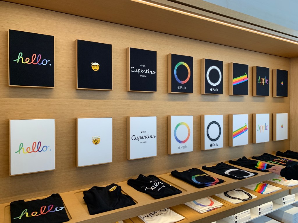 其實這棟訪客中心跟所有第三代的 Apple Store 大同小異,玻璃外牆和木頭屋頂,信義 A13 的 Apple Store 就是這裡的縮小版,關於信義 A13 我也寫過一篇開幕那天的心得文 Apple 信義 A13 開幕!。店中的蘋果產品沒有比較特別,也不會打折,但是這邊有一整櫃全世界只有這裡有賣的紀念品,有上圖的 T-Shirt,每一季會更換幾款,有購物袋、棒球帽、蘋果產品的記憶小卡(當時覺得這沒什麼用,但回來之後有點後悔沒買)。題外話去離這裡十分鐘車程的蘋果舊總部 1 Infinite Loop 的話還會有不同款式的衣服,還有筆記本、保溫瓶跟馬克杯(我全買了)。總之基本上去那裡就是買一堆紀念品就對了。
