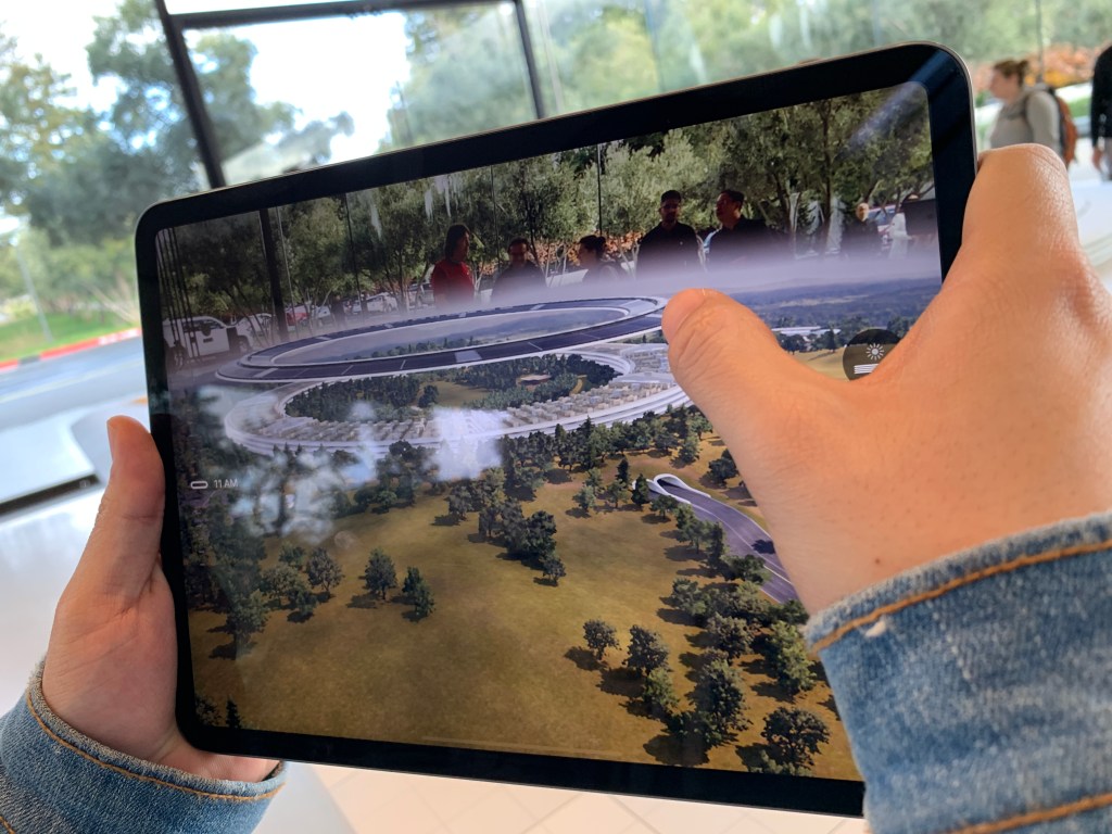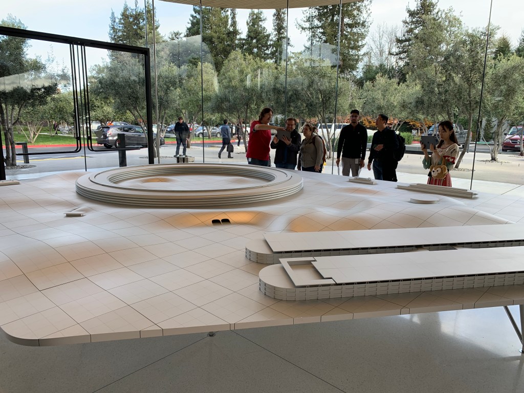 繞到訪客中心的另一邊是一個 AR 展示區,會有店員拿著一疊的 11 吋 iPad Pro,拿來對著上面這個完整的 Apple Park 模型之後螢幕上就會顯示出真的 Apple Park,還可以在螢幕上互動,可以拉起屋頂看內部構造,內部是怎麼通風的等等,除了讓大家更了解主建築之外,這也算是 Apple AR 的火力展示了,雖然有模型的輔助,但這個 AR 的基準定位真的做得非常穩,完全不會有任何的滑動。