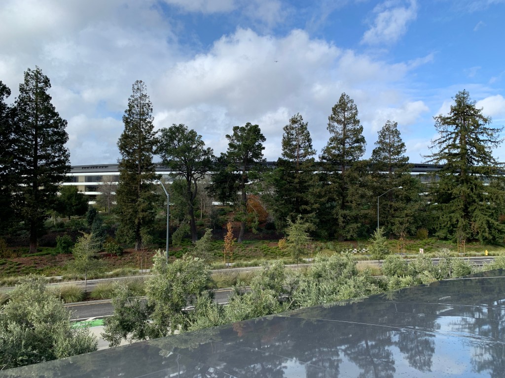 走上跟 A13 一樣由 Jony Ive 設計的樓梯來到二樓的陽台,這邊可以看到藏在樹後的 Apple Park 本體,這邊是凡人能夠離他最近的地方了,站在這邊的感覺真的很神奇。