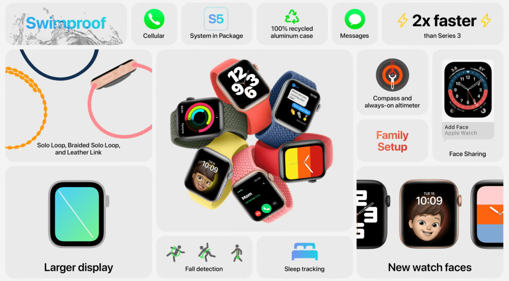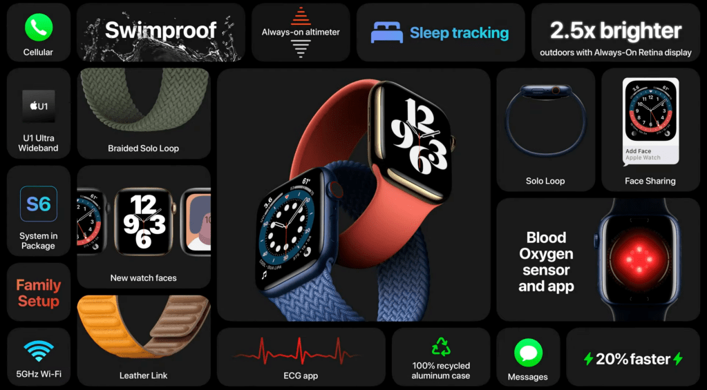 硬體部份的更新還有最高可以達到 2.5 倍亮度的 Always-On Retina 以及常啟高度計。再來是足足五種全新錶面,我就想說今年 watchOS 7 更新怎麼只有一個新錶面,原來是在等這時候才發表,希望不要是 Series 6 限定。新錶帶當然也少不了,全新的單圈錶環,有橡膠和編織兩種材質,並有九種尺寸可以選,我打算開賣第一天就去店裡買,超級好看的。