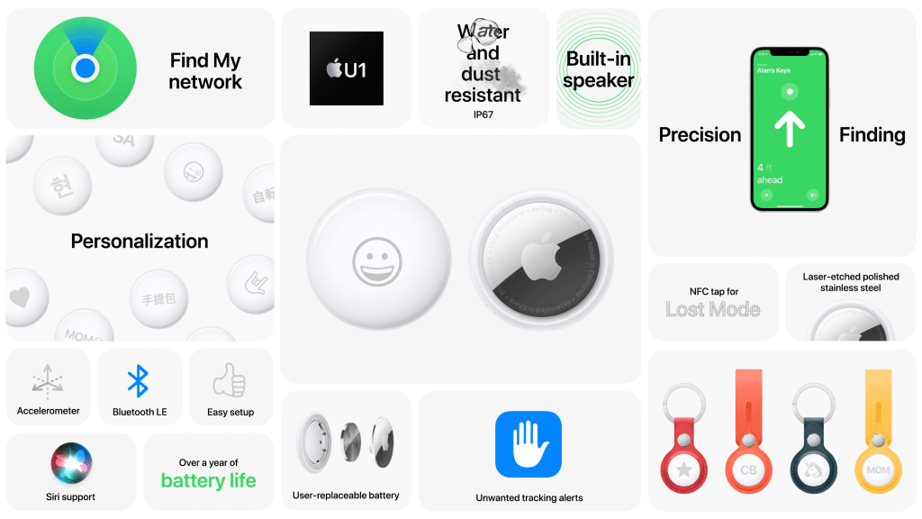 前陣子 Apple 剛開放讓第三方廠商製造支援 Find My 的產品,現在終於發表了這款傳聞傳了很久的 AirTag。開頭就用了一支非常有趣的宣傳片,大家可以去看看,很完美的展示了這顆小鈕扣的功能。AirTag 使用 Find My 網路來定位,可以讓他發出聲響,也有遺失模式,有用過 Find My 的人應該非常熟悉,並且他依舊注重隱私。iPhone 11 以上因為有 U1 晶片,所以可以使用精確尋找功能,他會顯示你與 AirTag 的距離和方向。你可以雷射雋刻文字或 Emoji 來客製化 AirTag,也有另外販售 PU 材質掛環跟皮革鑰匙圈。最後他是使用標準的鈕扣電池,一顆可以使用一年且容易更換。