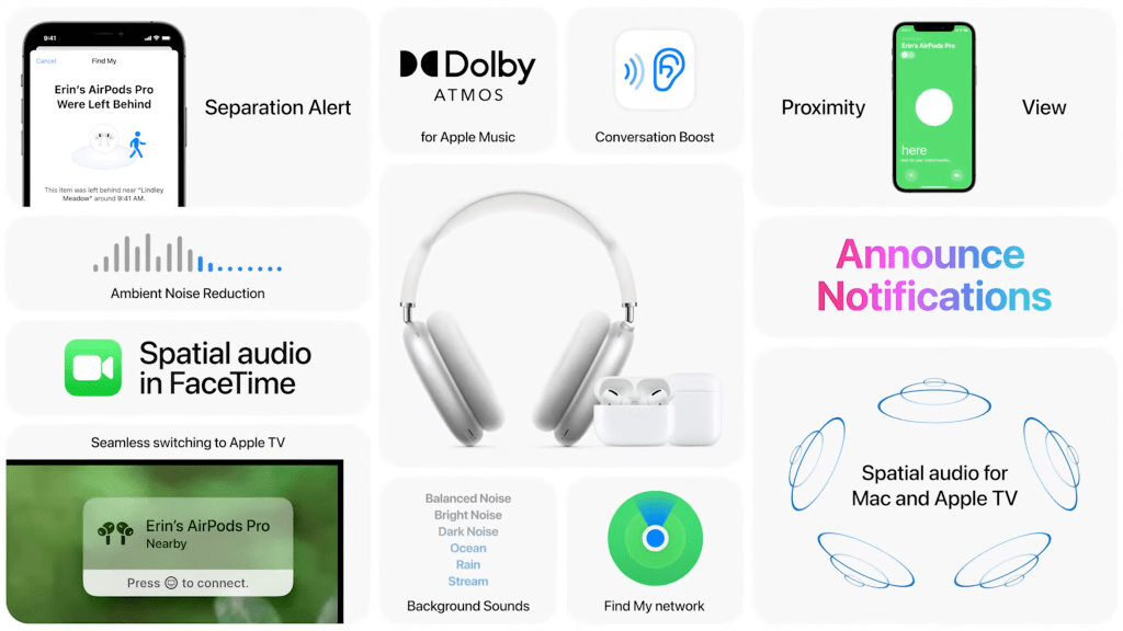 大概就三個重點,1. 增強了 AirPods Pro 的助聽器功能,2. Siri 現在會唸特定通知給你聽,如果你的購物清單提醒事項有設定地點在超市,你到超市的時候他就會開始唸購物清單給你聽,真的有必要嗎這種功能… 3. AirPods Pro 跟 AirPods Max 裡因為有 U1 晶片,所以基本上他們就是 AirTag,所以他們有一樣的功能了,沒有連到也可以定位出在哪裡、可以播放聲音,距離夠近的時候還會顯示他在什麼方向離你多遠。