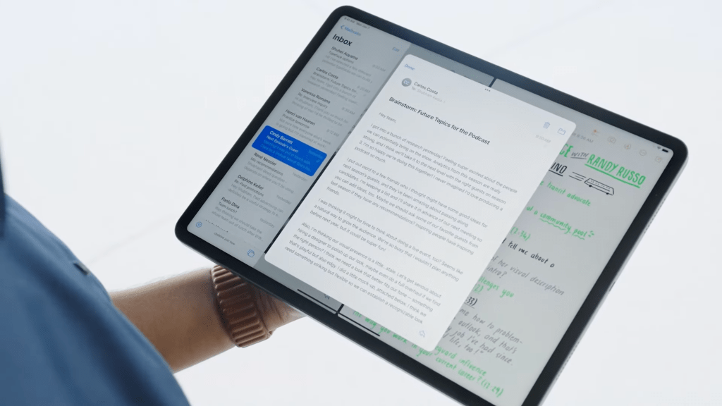 這次在 Split View 做了蠻大的改變,我儘我可能的用文字來講解,希望之後 Apple 會出影片教學。在任何視窗上都會有三個小點叫做多工選單,點了之後可以選擇讓他固定在螢幕左半、右半或是全螢幕,進入左右分割畫面後,你如果想要把左邊的 App 替換成別的,你只要從他上面的多工選單用力往下滑,就會回到主畫面讓你選擇你想換的 App。有支援分頁的 App 像是郵件,你可以按住想預覽的郵件後選擇顯示在中央,他就會像上圖一樣出現一個浮在中間的視窗讓你快速預覽。中央視窗同樣也有多工選單,按了之後也可以選擇要把它移到左半右半或全螢幕。比較複雜的部分是這次新增了一個叫做 “The Shelf” 的空間,讓你可以把 App 暫存在這裡,等等開別的 App 的時候再叫出來,只要從中間視窗的多工選單往下滑就可以了。我老實說,我剛剛實際操作了 15 分鐘,還是沒有很懂這個 shelf 是在幹嘛,我大概也不會用到它,這功能是真的有點謎。