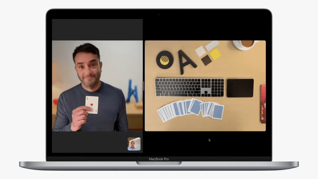 最後來到我最期待的 Continuity 接續互通環節了。FaceTime 現在支援接力了,你用 iPhone 在FaceTime,當你回到家打開你的 Mac,上面就會跳出來讓你可以直接切換到 Mac 繼續 FaceTime,當然 iPad 也行。再來是一個大家議論紛紛的功能,Mac 好不容易才得到了新的 1080p 鏡頭,然後 macOS 出了一個新功能叫做接續互通相機,是一個近幾年很多第三方軟體在做的事情,讓你可以用 iPhone 當作 Mac 的鏡頭使用,畢竟筆電鏡頭再怎麼升級終究是比不過你手機上那大大的幾顆鏡頭,除非你還在用 iPhone 4。他們甚至還跟 Belkin 合作要推出一個 MagSafe 配件讓你可以把手機架在 MacBook 螢幕上。而且有了 iPhone 的後鏡頭,現在還可以使用人物居中和人像模式,還可以調整不同的攝影棚燈光效果。真沒想到人物居中是用這種形式來登上 Mac。