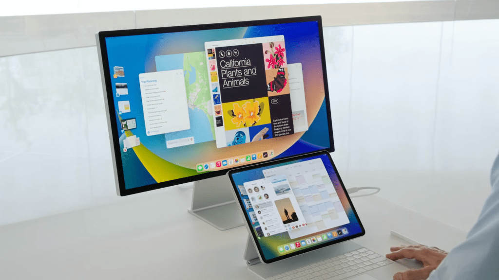 12.9 吋的 iPad Pro 搭載著 Liquid Retina XDR 螢幕,現在更支援了新的參照模式,可以精確顯示 SDR 或 HDR 的色彩標準,讓你可以用 iPad Pro 來進行精準的調色,無論是單獨使用 iPad 時或是使用 Sidecar 來當作 Mac 的外接螢幕時都能啟用。最後就是我最害怕看到的 M1 獨佔功能了。首先是可以調整顯示縮放模式,讓你調整畫面的解析度來取得更多空間。再來就是被我猜中的幕前調度功能,他果然是為了 iPad 打造的,如何運作的我就不再解釋一次了,跟 macOS 上的基本一模一樣。特別的是這是第一次 iPad 可以調整 App 的視窗大小,但似乎還不是像 Mac 一樣是完全自由的,畢竟這些還是 iPad App,他只能在幾個特定大小間調整。而有了幕前調度,現在 iPad 終於真正的支援外接顯示器了,就像把筆電接到外接顯示器一樣可以當作獨立的桌面來使用,終於。