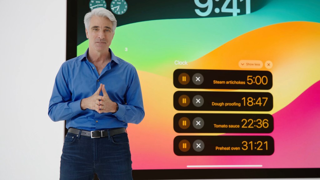 即時動態也來到 iPad 上了,這是第二年用 UberEats 來 demo 即時動態了,然而我的 UberEats 還是沒有即時動態,我真的快氣死了。另外終於可以同時設定多個計時器了,這都已經變成一個梗了,Craig 也很懂的自嘲了一下說我們真的活在一個神奇的年代。除了上述這些都是 iOS 也會有的功能之外,健康 App 終於來到 iPad 上了,就這樣。內建的 PDF 工具多了一些新功能,現在會更準確的偵測填寫欄位,並且可以使用自動填寫,所以什麼時候才要給我完整的 Finder 跟預覽程式,你都放 M 晶片了,我是覺得我的要求不過份啦,Final Cut Pro 跟 Logic Pro 都來了,至少預覽程式不難吧,拜託啦 Craig。