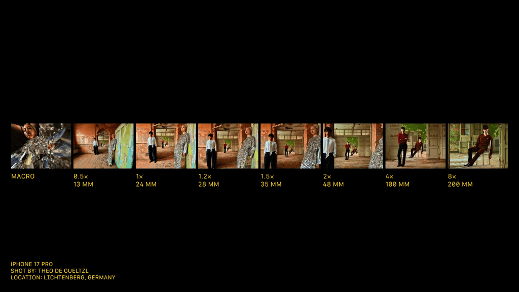 iPhone 17 Pro 的相機升級幅度不小,正面同樣是 1800 萬的前置相機,而背面的三個相機現在都是 4800 萬像素融合相機。望遠鏡頭現在變成是 4x 並且因為是融合相機所以可以無損放大到 8x。融合相機讓 iPhone 用三顆鏡頭就有超多焦段可以使用,非常方便。