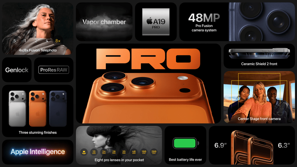 全新的去離子水均溫板,不是什麼新技術了,但謠傳了好多年如今終於正式搭載到 iPhone,搭配比鈦金屬高 20 倍導熱效率的鋁金屬機身,希望可以一舉解決祖傳的散熱問題,把 A19 Pro 的性能拉到更高。iPhone 17 Pro 的 A19 Pro 比 iPhone Air 的 GPU 再多一顆核心,並且持續效能表現相較 iPhone 16 Pro 可以提升高達 40%。全新設計的相機模組和天線整合進一體成型機身,和 iPhone Air 同樣背面是超瓷晶盾,正面是超瓷晶盾 2,提升整機的堅固程度。