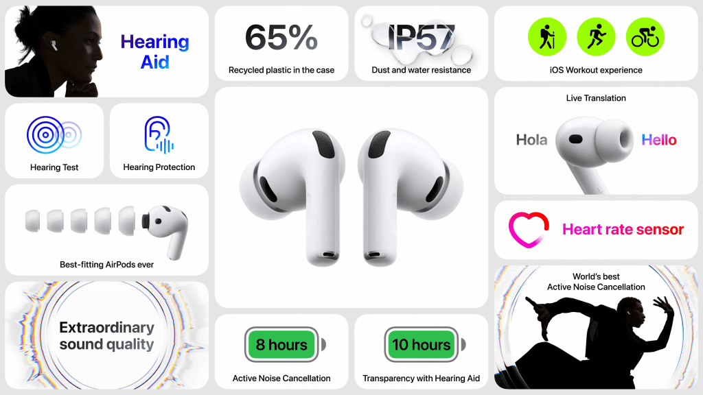 AirPods Pro 3 的形狀經過重新設計,體積更小之外,耳塞的方向也和以前不同,並且提供五種尺寸的耳塞,盡可能的貼合更多人的耳朵。這也是第一款獲得 IP57 防塵抗水認證的 AirPods。這次新增了先前在 Powerbeats Pro 2 中搭載的心率感測器,這是 Apple 目前最小的心率感測器,讓你運動時不需要戴著 Apple Watch 也能偵測心率。iPhone 上的健身 App 也多了一個體能訓練分頁,沒有 Apple Watch 的人也能開始記錄體能訓練了。